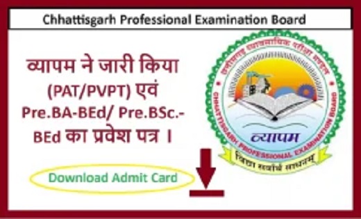 रायपुर। छत्तीसगढ़ व्यावसायिक परीक्षा मंडल (व्यापमं) ने पीएटी, पीपीटी के साथ ही प्री बीएबीएड और प्री बीएससी बीएड के प्रवेश पत्र जारी कर दिए हैं. उक्त प्रवेश परीक्षाएं 9 जून को आयोजित की जाएंगी. सुबह की पाली में पीएटी और पीवीपीटी तथा दूसरी पाली में प्रीबीए बीएड और बीएससी बीएड का आयोजन किया जाएगा. अभ्यर्थी प्रवेश पत्र व्यापमं की वेबसाइट से डाउनलोड कर सकते हैं. अभ्यर्थियों को उनके पंजीकृत मोबाइल नंबर पर एसएमएस SMS के माध्यम से एक संक्षिप्त यूआरएल भी भेजा जाएगा.