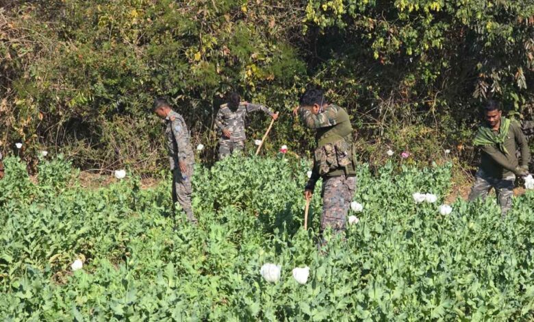 Ambikapur: छत्तीसगढ़ मध्य प्रदेश की सीमा में स्थित कुसमी जनपद पंचायत क्षेत्र की ग्राम पंचायत खजूरी के आश्रित गांव तुरीपानी में भी अफीम की खेती का बड़ा मामला सामने आया है. इससे 2 दिन पहले कुसमी जनपद क्षेत्र के ही त्रिपुरी गांव में भी साढ़े तीन एकड़ से अधिक क्षेत्र में अफीम की खेती का खुलासा हुआ था और प्रशासनिक टीम इसकी कार्रवाई में जुटी हुई थी. इसी बीच खजूरी पंचायत में भी अफीम की खेती का पता चला और उसके बाद देर शाम प्रशासन और पुलिस की टीम मौके पर पहुंची इसके बाद अधिकारियों ने पूरे इलाके को सील कर दिया और भारी संख्या में पुलिस बल तैनात किया गया आज इस पूरे मामले में कार्रवाई की जाएगी हालांकि अभी तक पता नहीं चल सका है कि अफीम की खेती करने वाला माफिया कौन है. खजूरी पंचायत में अफीम की खेती के मामले में पुलिस के द्वारा दो लोगों को हिरासत में लिया गया है. उनसे खेती के संबंध में पूछताछ की जा रही है, बताया जा रहा है कि दोनों व्यक्ति जमीन मालिक हैं.