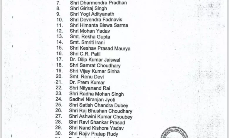 रायपुर/दिल्ली। बिहार विधानसभा चुनाव के पहले चरण से पहले भाजपा ने अपने स्टार प्रचारकों की सूची जारी कर दी है। इस सूची में प्रधानमंत्री नरेंद्र मोदी, भाजपा के राष्ट्रीय अध्यक्ष जेपी नड्डा, केंद्रीय मंत्री अमित शाह, राजनाथ सिंह, नितिन गडकरी, मध्य प्रदेश के मुख्यमंत्री शिवराज सिंह चौहान, असम के मुख्यमंत्री हिमंत बिस्वा सरमा, और उत्तर प्रदेश के मुख्यमंत्री योगी आदित्यनाथ समेत कई शीर्ष नेताओं के नाम शामिल हैं।