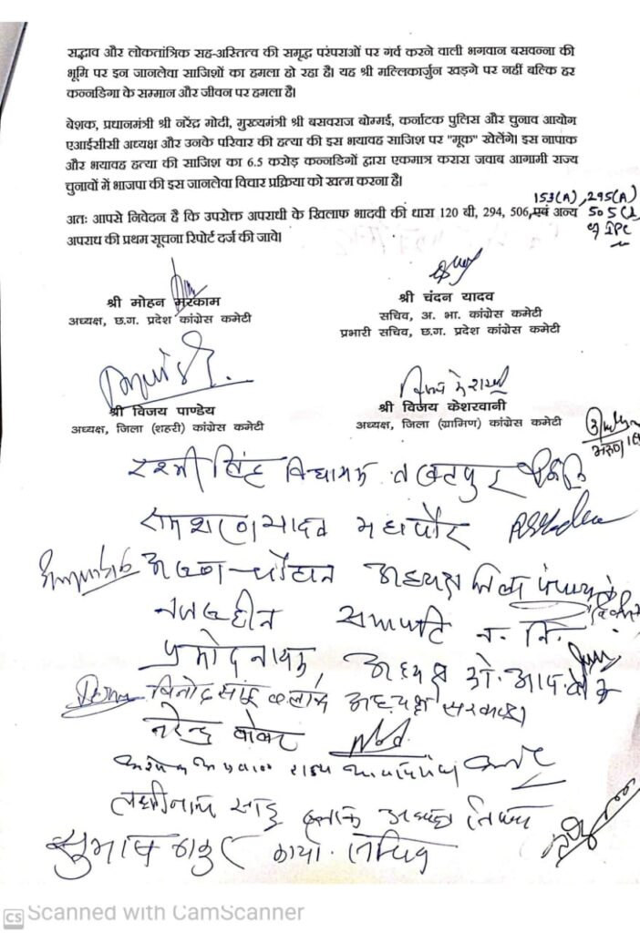 रायपुर  पीसीसी चीफ मोहन मरकाम और एआईसीसी सचिव सह प्रदेश प्रभारी चन्दन यादव ने रविवार को सिविल लाइन थाने में टीआई को कर्णाटक के चित्तपुर से भाजपा प्रत्याशी मणिकांत राठौर के खिलाफ कार्रवाई करने के लिए ज्ञापन सौंपा। मोहन मरकाम ने कहा कि कर्नाटक चुनाव में भाजपा को करारी हार दिख रही है। कर्नाटक की जनता मोदी-शाह और भाजपा को सत्ता से बेदखल करने का मन बना लिया है। मोदी और शाह का झूठ पर पंच वहां पर असफल हो गया है। ऐसे में भाजपा अब करारी हार के डर से कांग्रेस के राष्ट्रीय अध्यक्ष मल्लिकार्जुन खड़गे और उनके परिवारजनों की हत्या की साजिश रच रही हैं। यह भाजपा के प्रत्याशी मणिकांत राठौर के वायरल ऑडियो से स्पष्ट समझ में आ रहा है। भाजपा चुनाव जीतने के लिए कर्नाटक में एक बड़ी साजिश रच रही है ऐसा प्रतीत होता है।