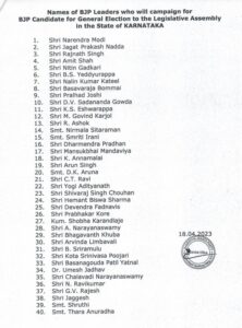 कर्नाटक में 10 मई को होने वाले विधानसभा चुनाव के लिए भारतीय जनता पार्टी (भाजपा) ने मंगलवार को स्टार प्रचारकों की सूची जारी की। इस सूची में प्रधानमंत्री नरेंद्र मोदी, जेपी नड्डा, राजनाथ सिंह और अमित शाह समेत 40 नेताओं के नाम शामिल हैं, जो राज्य में चुनाव प्रचार करेंगे।