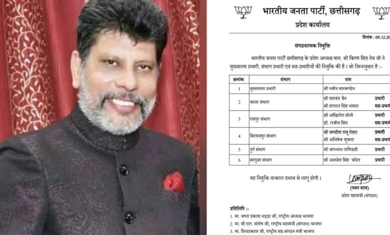 BJP की नई टीम तैयार…छत्तीसगढ़ में संभाग प्रभारियों की लिस्ट जारी, जानें नवीन मारकण्डेय की नई भूमिका और पार्टी की रणनीति