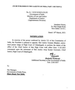 अधिसूचना में कहा गया, ” भारत के संविधान के अनुच्छेद 223 द्वारा प्रदत्त शक्ति का प्रयोग करते हुए राष्ट्रपति ने मुख्य न्यायाधीश के कार्यालय के कर्तव्यों का पालन करने के लिए, छत्तीसगढ़ हाईकोर्ट के वरिष्ठतम न्यायालय के न्यायाधीश जस्टिस गौतम भादुड़ी को नियुक्त किया है। छत्तीसगढ़ हाईकोर्ट के मुख्य न्यायाधीश जस्टिस अरूप कुमार गोस्वामी की सेवानिवृत्ति के परिणामस्वरूप 11.03.2023 से यह नियुक्ति प्रभावी होगी।”