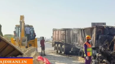 नेशनल हाईवे में सड़क हादसा : जिप्शम से भरे ट्रक को ट्रेलर ने मारी टक्कर, चालक की जलकर मौत