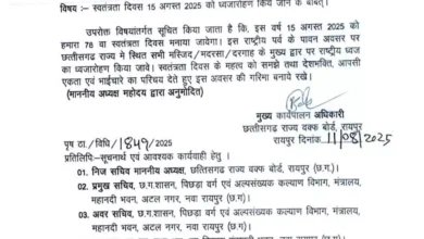 रायपुर। छत्तीसगढ़ राज्य वक्फ बोर्ड ने स्वतंत्रता दिवस के मौके पर राज्यभर की सभी मस्जिद, मदरसा और दरगाहों में राष्ट्रीय…