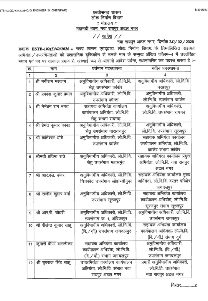 रायपुर। छत्तीसगढ़ शासन के लोक निर्माण विभाग ने प्रशासनिक दृष्टिकोण से बड़ा फेरबदल करते हुए 17 सहायक अभियंता/अनुविभागीय अधिकारियों के तबादले का आदेश जारी किया है। महानदी भवन, मंत्रालय नया रायपुर अटल नगर से 20 फरवरी 2026 को जारी आदेश क्रमांक ESTB-102(2)/42/2026 के तहत इन अधिकारियों को उनके वर्तमान पदस्थापना स्थल से स्थानांतरित कर नवीन पदस्थापना पर भेजा गया है। आदेश में स्पष्ट किया गया है कि सभी स्थानांतरण तत्काल प्रभाव से लागू होंगे और आगामी आदेश तक प्रभावी रहेंगे।