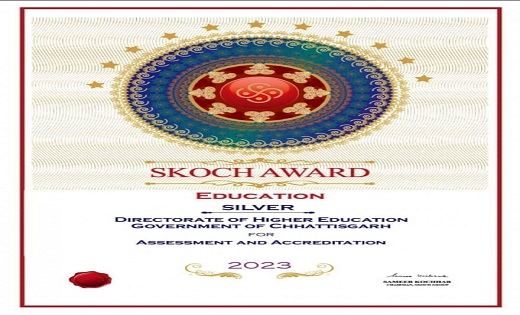 रायपुर। उच्च शिक्षा विभाग को छत्तीसगढ़ के ‘‘प्रोजेक्ट असेसमेंट एंड एक्रेडिटेशन‘‘ को देश की प्रतिष्ठित स्कॉच सिल्वर अवार्ड प्रदान किया गया है। विभाग को यह अवार्ड देश के कई बड़े एवं महत्वपूर्ण प्रोजेक्ट के साथ प्रतियोगिता करते हुए कई चरणों की प्रस्तुतिकरण, वोटिंग एवं उपलब्धियों के कारण प्रदान किया गया है। इस उपलब्धि के लिए मुख्यमंत्री भूपेश बघेल और उच्च शिक्षा मंत्री उमेश पटेल ने विभाग के अधिकारियों को कर्मचारियों को बधाई और शुभकामनाएं दी है।