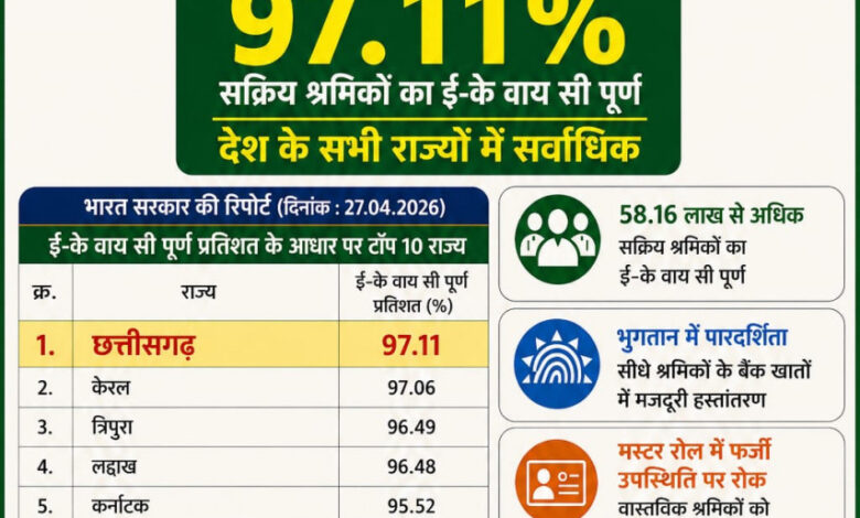 रिपोर्ट के अनुसार छत्तीसगढ़ में कुल 58 लाख से अधिक सक्रिय श्रमिकों में से 56 लाख से अधिक का ई-के वाय सी सफलतापूर्वक पूर्ण किया जा चुका है। यह उपलब्धि न केवल प्रशासनिक दक्षता को दर्शाती है, बल्कि ग्रामीण क्षेत्रों में डिजिटल सशक्तिकरण की दिशा में भी एक महत्वपूर्ण कदम है।