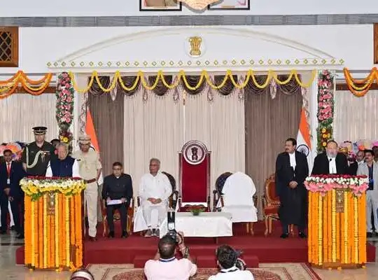रायपुर। विश्वभूषण हरिचंदन ने आज राजभवन के दरबार में आयोजित गरिमामय समारोह में छत्तीसगढ़ के नौवें राज्यपाल के रूप में अपने पद की शपथ ली। उच्च न्यायालय, बिलासपुर के मुख्य न्यायधिपति न्यायमूर्ति अरूप कुमार गोस्वामी ने उन्हें शपथ दिलाई। इस अवसर पर प्रथम महिला सुप्रभा हरिचंदन भी उपस्थित रहीं।छत्तीसगढ़ के नए राज्यपाल के रूप में शपथ ग्रहण उपरांत प्रदेश के मुख्यमंत्री भूपेश बघेल ने पुष्पगुच्छ भेंटकर अभिवादन किया और शुभकामनाएं दी।