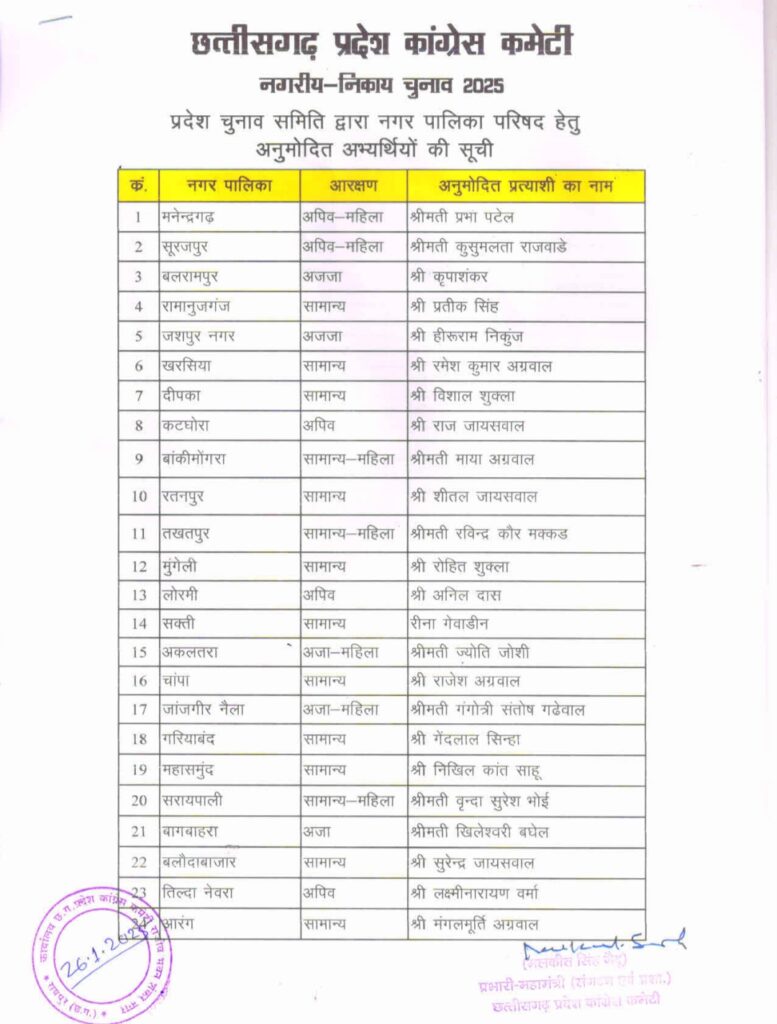 निकाय चुनाव: कांग्रेस ने नगरपालिका अध्यक्ष प्रत्याशियों के नामों की जारी की सूची, देखें लिस्ट में इनके हैं नाम..