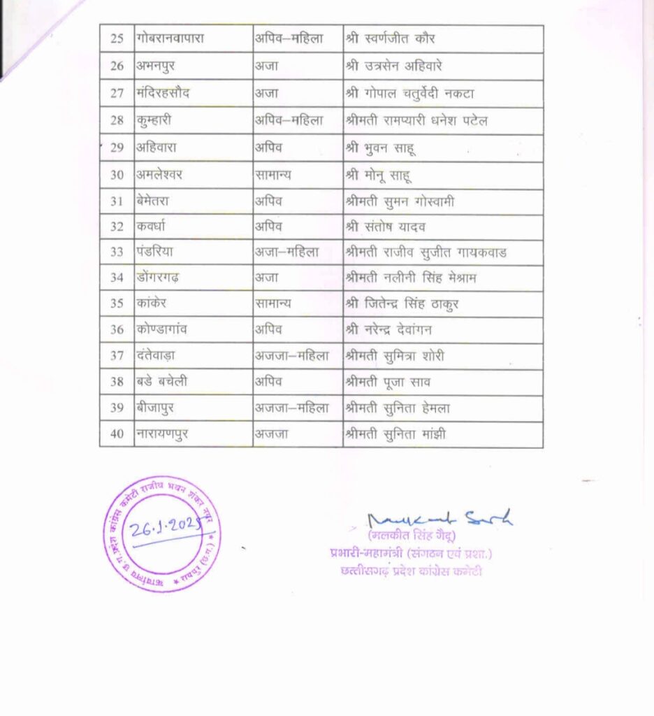 रायपुर :- छत्तीसगढ़ में नगरीय निकाय चुनाव से जुड़ी एक बड़ी खबर है। कांग्रेस ने रविवार देर रात 40 नगर पालिका परिषद के अध्यक्ष पद के प्रत्याशियों की सूची जारी कर दी है।
