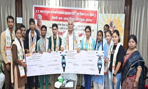 रायपुर, 15 जून 2023/ मुख्यमंत्री भूपेश बघेल ने आज अपने निवास कार्यालय में 10वीं एवं 12वीं बोर्ड में प्रावीण्य सूची में टॉप-10 में जगह बनाने वाले श्रमिक परिवार के बच्चों को एक-एक लाख का चेक का प्रतीक स्वरूप प्रदान किया। छात्रों की खुशी उस समय दोगुनी हो गई, जब मुख्यमंत्री ने इन होनहार बच्चों की आगे की पढ़ाई में सुविधा हेतु स्कूटी खरीदने के लिए एक-एक लाख देने की घोषणा करते हुए एक प्रतीक चेक अलग से प्रदान किया।