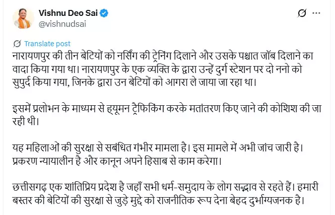 सीएम साय ने यह भी कहा कि छत्तीसगढ़ एक शांतिप्रिय और समावेशी प्रदेश है, जहाँ सभी धर्म और समुदाय के लोग सौहार्द्र से रहते हैं। लेकिन बस्तर की बेटियों के इस संवेदनशील मुद्दे को राजनीतिक रंग देना दुर्भाग्यपूर्ण है।
