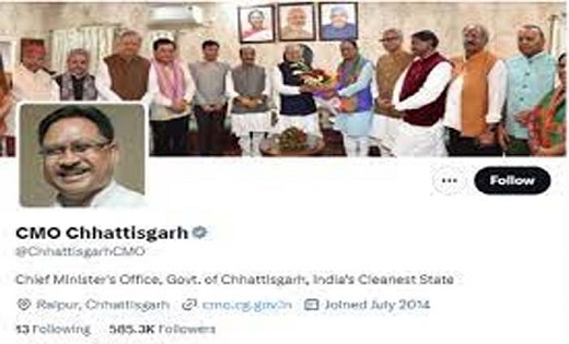 रायपुर : CMO छत्तीसगढ़ ने ट्विटर हैंडल में बदली मुख्यमंत्री की तस्वीर ,पूर्व मुख्यमंत्री भूपेश बघेल की जगह नव निर्वाचित मुख्यमंत्री विष्णुदेव साय की लगी फ़ोटो राज्यपाल ने विष्णुदेव साय को मुख्यमंत्री बनने के लिए बधाई एवं शुभकामनाएं दीं राज्यपाल विश्वभूषण हरिचंदन ने विष्णुदेव साय को विधायक दल का नेता चयनित होने के पश्चात मुख्यमंत्री नियुक्त किया उन्होंने साय को मुख्यमंत्री नियुक्त करने सम्बन्धित पत्र प्रदान कर कैबिनेट गठन हेतु आमंत्रित किया।