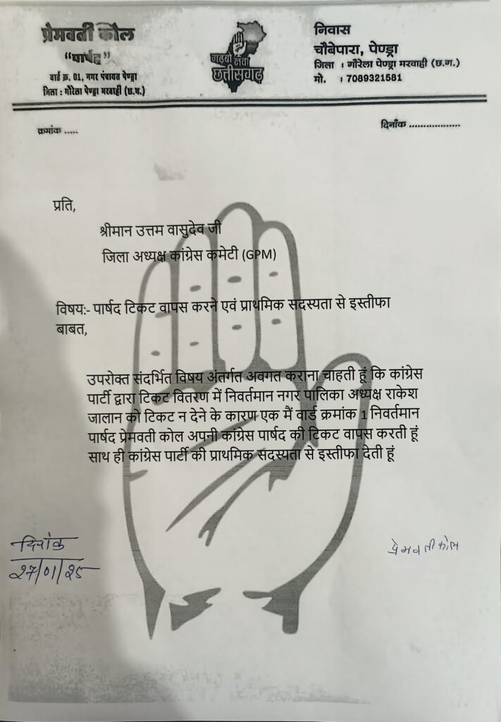 रायपुर :- गौरेला पेंड्रा मरवाही जिले से एक बड़ी खबर निकाल कर सामने आ रही है। नगर पालिका पेंड्रा के अध्यक्ष पद हेतु कांग्रेस पार्टी ने जब से पंकज तिवारी को नगर पालिका अध्यक्ष पद हेतु प्रत्याशी बनाया है। तब से ही पार्टी में असंतोष फैला है। कांग्रेस पार्टी की वार्ड क्रमांक 1 से निवर्तमान पार्षद एवं कांग्रेस पार्टी से प्रत्याशी प्रेमवती कोल ने अपना टिकट वापस लौटा दिया है साथ ही कांग्रेस पार्टी की प्राथमिक सदस्यता से इस्तीफा दे दिया है।