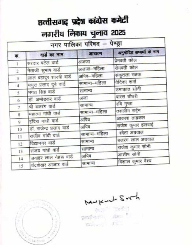 कांग्रेस के पार्षद प्रत्याशी ने लौटाई टिकट, पेंड्रा नगर पालिका अध्यक्ष प्रत्याशी के गलत चयन पर जताया असंतोष..