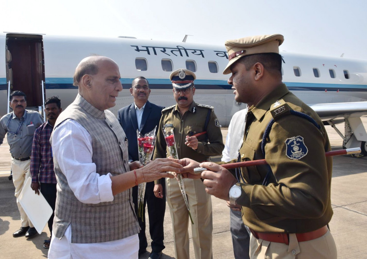 रायपुर। केंद्रीय रक्षामंत्री राजनाथ सिंह अपने संक्षिप्त प्रवास में जगदलपुर के मां दंतेश्वरी एयरपोर्ट पहुंचे। रक्षामंत्री सिंह का कमिश्नर श्याम धावड़े, आईजी सुंदरराज पी., कलेक्टर विजय दयाराम के. पुलिस अधीक्षक शलभ सिन्हा ने स्वागत किया। रक्षामंत्री सिंह अपने निर्धारित कार्यक्रम के तहत विशेष विमान से जगदलपुर पहुंचे थे। यहां से ओड़िसा राज्य के नबरंगपुर के लिए हेलीकॉप्टर से रवाना हुए।