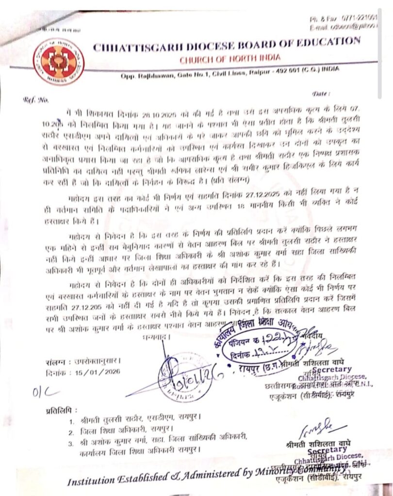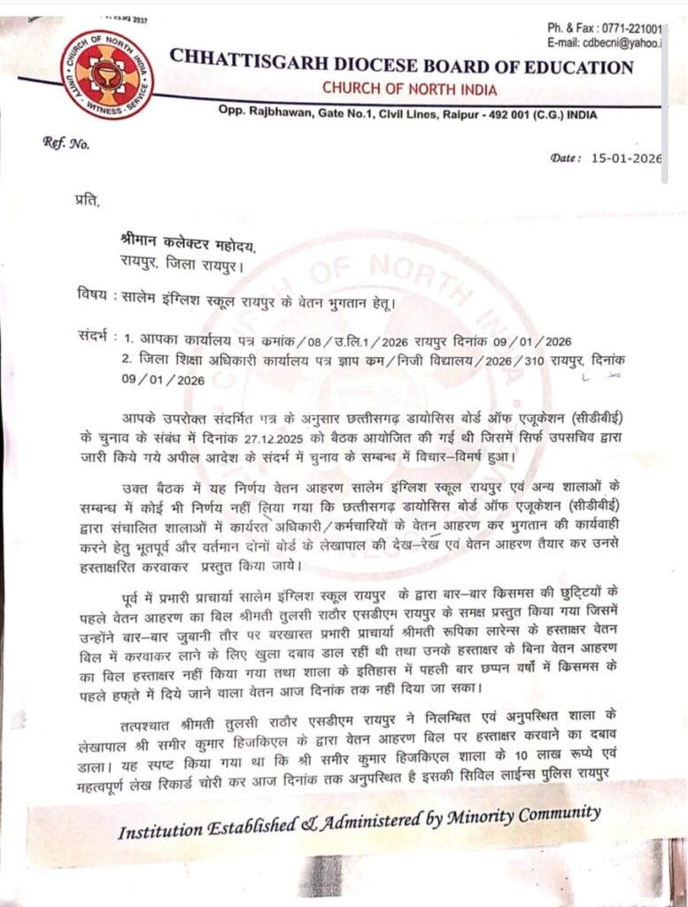 छत्तीसगढ़ डायोसिस के वैध पदाधिकारियों ने दो टूक कहा है “हमें शासन, पुलिस के वरिष्ठ अधिकारियों और रायपुर कलेक्टर पर पूरा भरोसा है। प्रशासक कानून के तहत चुनाव कराएंगे और सच्चाई सामने आएगी। बच्चों के भविष्य से खिलवाड़ करने वालों को बख्शा नहीं जाना चाहिए।”