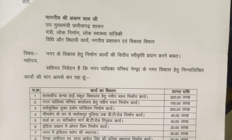 उक्त कार्यक्रम में पेंड्रा नगर पालिका के अध्यक्ष राकेश जालान ने उप मुख्यमंत्री अरुण साव से पेण्ड्रा नगर वासियों की सबसे पुरानी मांग पेण्ड्रा बायपास का निर्माण का कार्य अतिशीघ्र कराया जाए। साथ ही पेंड्रा नगर के विकास को ध्यान में रखते हुए विभिन्न विकास कार्यों के लिए 31 करोड़ 75 लाख रुपए की मांग की है। जिसमें शासकीय कन्या हाई स्कूल विद्यालय हेतु नवीन भवन निर्माण कार्य के लिए 2 करोड़ रुपए, नगर पालिका परिषद कार्यालय हेतु नवीन भवन निर्माण कार्य के लिए 1 करोड़ 50 लाख रुपए , नगर में सर्वसुविधा युक्त इंडोर स्टेडियम निर्माण कार्य के लिए 2 करोड़ रुपए , भीमसेन के घर से सतोकपुर पुलिया तक बी.टी. रोड निर्माण कार्य के लिए 45 लाख रुपए,वार्ड क्र. 01 बंटीबहेरा मार्ग में बी.टी. रोड रिनूवल कार्य के लिए 40 लाख रुपए, इंदिरा उद्यान में ओपन जिम निर्माण कार्य के लिए 20 लाख रुपए ,नगर में इंडियन फ्लेग की स्थापना के लिए 30 लाख रुपए, पेण्ड्रा जमींदार स्व. लाल अमोल सिंह की प्रतिमा स्थापना निर्माण कार्य के लिए 20 लाख रुपए, बांधा तालाब का सौदर्गीकरण निर्माण कार्य के लिए 5 करोड़ रुपए, पेण्ड्रा में 03 नग स्वागत द्वार का निर्माण कार्य के लिए 50 लाख रुपए, नया बस स्टेण्ड से सेमरा तिराहा तक गौरव पथ निर्माण कार्य के लिए 3 करोड़ रुपए।