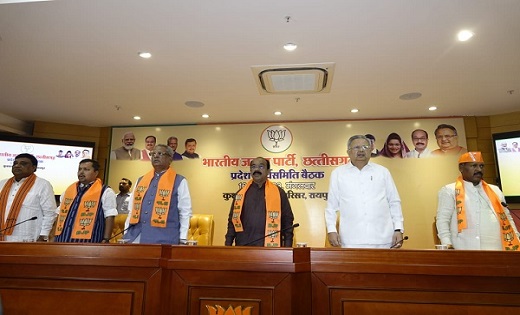 रायपुर। छत्तीसगढ़ के पूर्व मुख्यमंत्री तथा भाजपा के राष्ट्रीय उपाध्यक्ष डॉ. रमन सिंह आज कुशाभाऊ ठाकरे परिसर रायपुर में प्रदेश कार्यसमिति की बैठक में शामिल हुए इस दौरान भाजपा प्रदेश प्रभारी ओम माथुर, प्रदेश अध्यक्ष अरुण साव समेत भाजपा के कई दिग्गज नेता शामिल हुए।