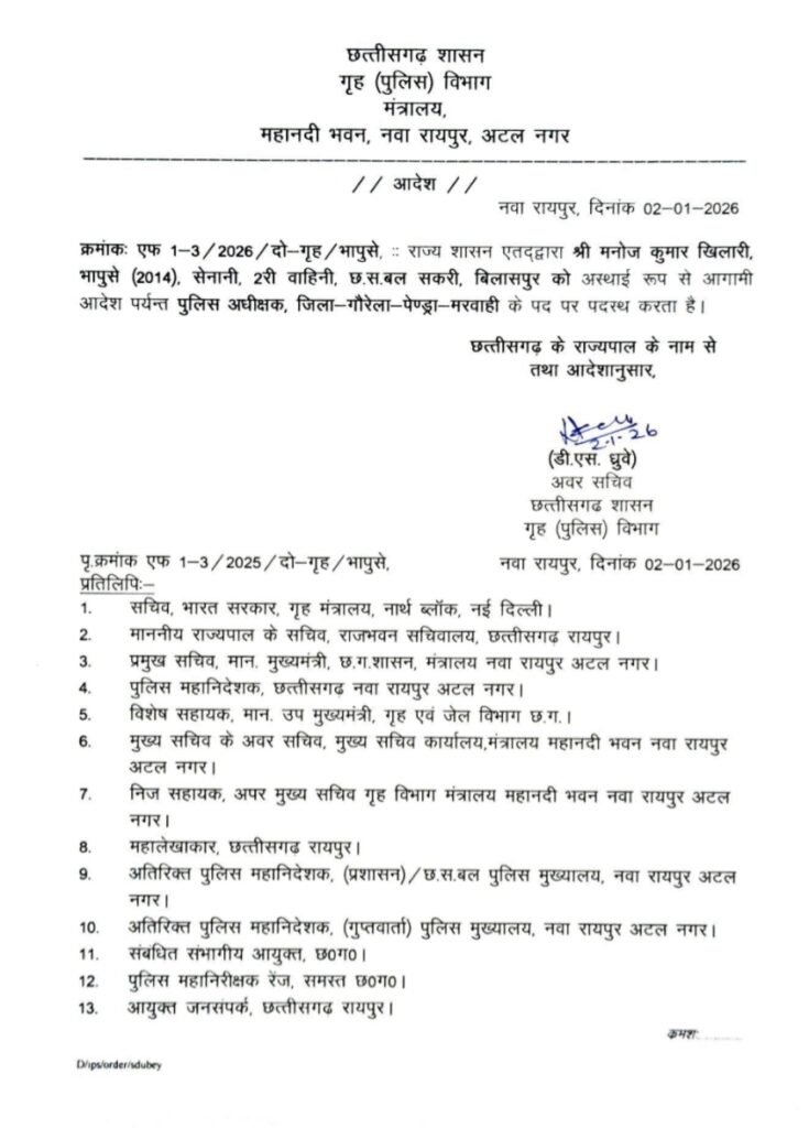 गौरेला–पेंड्रा–मरवाही को मिला नया SP, मनोज कुमार खिलारी संभालेंगे कमान..