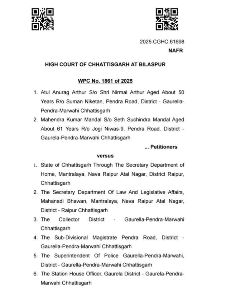 बिलासपुर।छत्तीसगढ़ हाई कोर्ट, बिलासपुर ने अतुल अनुराग अर्थर द्वारा दायर रिट याचिका (WPC No. 1861/2025) पर महत्वपूर्ण आदेश पारित करते हुए यह स्पष्ट कर दिया है कि कानून से ऊपर कोई नहीं है और चर्च अथवा मसीह समुदाय को डराने की कोशिशें स्वीकार्य नहीं हैं।