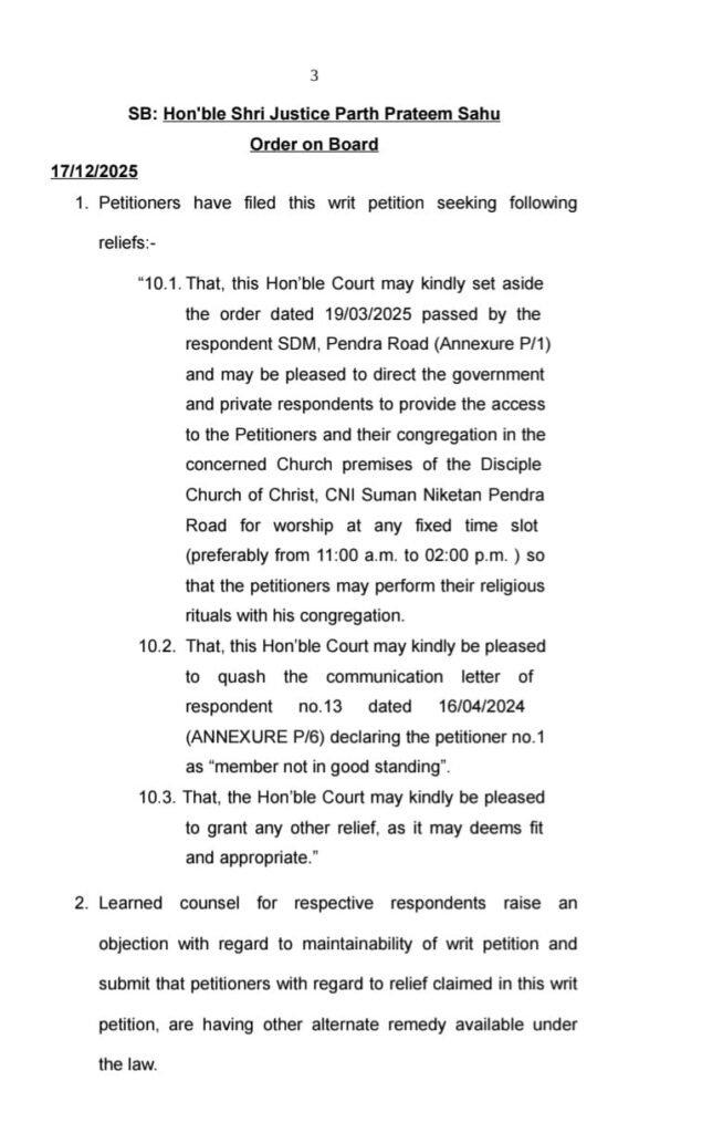 माननीय न्यायमूर्ति पार्थ प्रतीम साहू द्वारा पारित आदेश में न्यायालय ने साफ कहा कि याचिकाकर्ता अतुल अर्थर एवं अन्य को चर्च में प्रार्थना करने का अधिकार तो है, लेकिन केवल उन्हीं समयों में जो चर्च की वैध रूप से गठित प्रबंधन समिति द्वारा सभी के लिए तय किए गए हों।