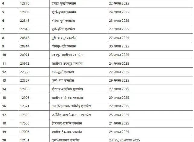 रायपुर। अगर आप अगस्त के आखिरी सप्ताह या सितंबर की शुरुआत में ट्रेन से सफर करने की योजना बना रहे हैं, तो यह खबर जरूर पढ़ें। भारतीय रेलवे ने यात्रियों को बड़ा झटका देते हुए कई महत्वपूर्ण ट्रेनों को रद्द करने का निर्णय लिया है।