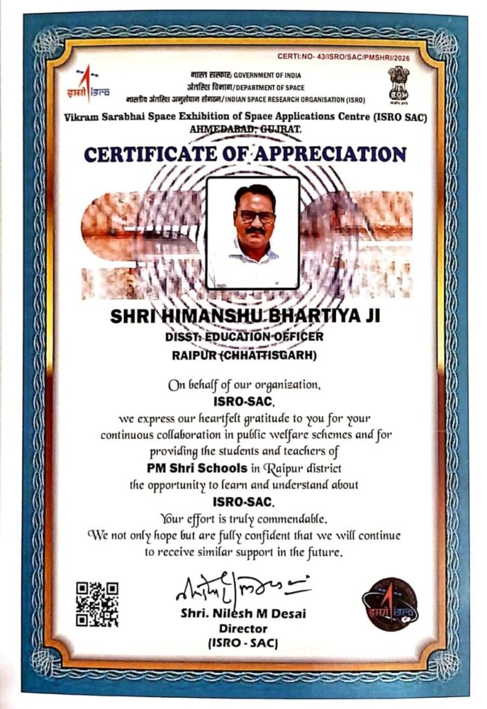 राज्य की सीमाओं से निकलकर राष्ट्रीय पहचान: ISRO-SAC ने रायपुर के DEO हिमांशु भरतिया को किया सम्मानित