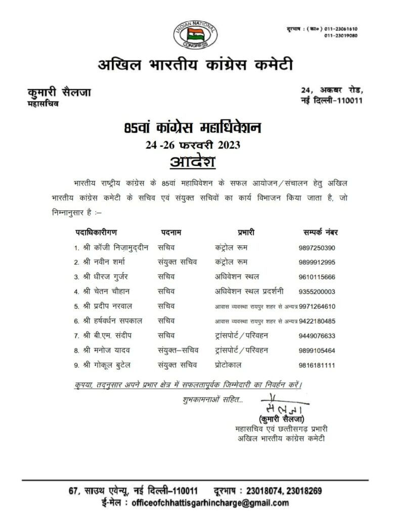 रायपुर। छत्तीसगढ़ की राजधानी रायपुर में 24 से 26 फरवरी 2030 तक होने वाले कांग्रेस के 85वें महाधिवेशन को लेकर प्रदेश की कांग्रेस प्रभारी कुमारी शैलजा ने पार्टी के सचिव और संयुक्त सचिव के कार्य का विभाजन किया है।
