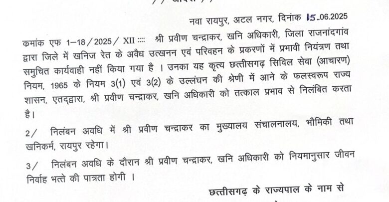 राजनांदगांव अवैध रेत खनन मामले पर बड़ी कार्यवाही,जिला खनिज अधिकारी निलंबित