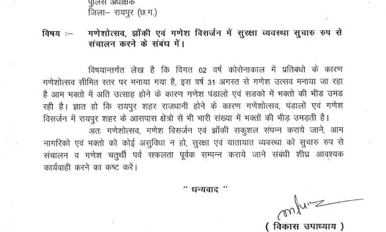 विधायक विकास उपाध्याय ने उक्त संबंध में गणेशोत्सव, गणेश विसर्जन एवं झाँकी सकुशल संपन्न कराये जाने, आम नागरिको एवं भक्तो को कोई असुविधा न हो, सुरक्षा एवं यातायात व्यवस्था को सुचारु रुप से संचालन व गणेश चतुर्थी पर्व सफलता पूर्वक सम्पन्न कराये जाने संबंधी रायपुर जिला के कलेक्टर, पुलिस अधीक्षक एवं निगम के आयुक्त को निर्देशित किया है।