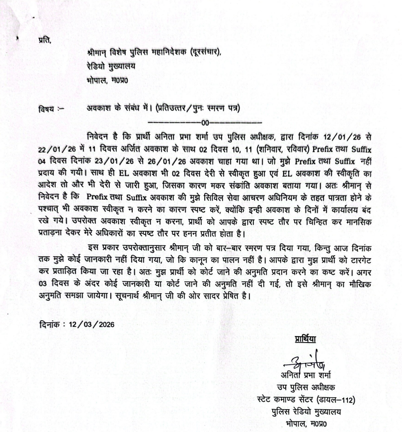 भोपाल स्थित पुलिस रेडियो मुख्यालय में पदस्थ DSP अनिता प्रभा शर्मा का मामला अब प्रशासनिक व्यवस्था पर सवाल खड़े कर रहा है। अलग-अलग आवेदनों के जरिए सामने आई जानकारी में उन्होंने अपने साथ कथित भेदभाव, दबाव और पक्षपात का आरोप लगाया है।