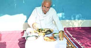 गरियाबंद जिले के बिंद्रानवागढ़ विधानसभा क्षेत्र के ग्राम परियाबाहरा में मुख्यमंत्री श्री भूपेश बघेल का आगमन भेंट मुलाकात कार्यक्रम के तहत हुआ। कार्यक्रम स्थल पर जाने से पहले मुख्यमंत्री ने दोपहर का भोजन ग्राम के आदिवासी किसान श्री गौकरण नागेश के घर किया। उनकी बहू  रूपेश्वरी नागेश ने मुख्यमंत्री को अपने हाथों से भोजन परोसा। उनके साथ प्रदेश के कैबिनेट मंत्री एवं जिले के प्रभारी मंत्री  अमरजीत भगत ने भी नागेश परिवार के भोजन का आनंद लिया। मिट्टी से बने कवेलूपोश घर की परछी (बरामदे) में जमीन पर बैठकर मुख्यमंत्री  बघेल ने कांदा भाजी, मुनगा बड़ी की सादा सब्जी के साथ गेहूं की रोटी, चावल-दाल, झुरगा आलू और गोभी-मटर की सब्जी का भी स्वाद चखा। इसके अलावा उन्होंने बिजौरी, अरसा, तिखुर, अचार, पापड़ भी खाया। इसके बाद मुख्यमंत्री ने नागेश परिवार का आभार व्यक्त करते हुए सभी परिजनों को उपहार भेंट किया।