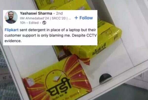 IIM अंडरग्रेजुएट यशस्वी शर्मा ने लिंक्डइन पर पोस्ट लिखकर इस घटना की जानकारी दी है। उन्होंने बताया कि फ्लिपकार्ट की ‘बिग बिलियन डेज सेल’ के दौरान एक लैपटॉप का ऑर्डर किया, लेकिन उन्हें इसकी जगह घड़ी डिटर्जेंट के पैक मिले। शर्मा ने जब फ्लिपकार्ट कस्टमर केयर से इसकी शिकायत की तो अधिकारियों ने अपनी गलती मानने से इनकार कर दिया।
