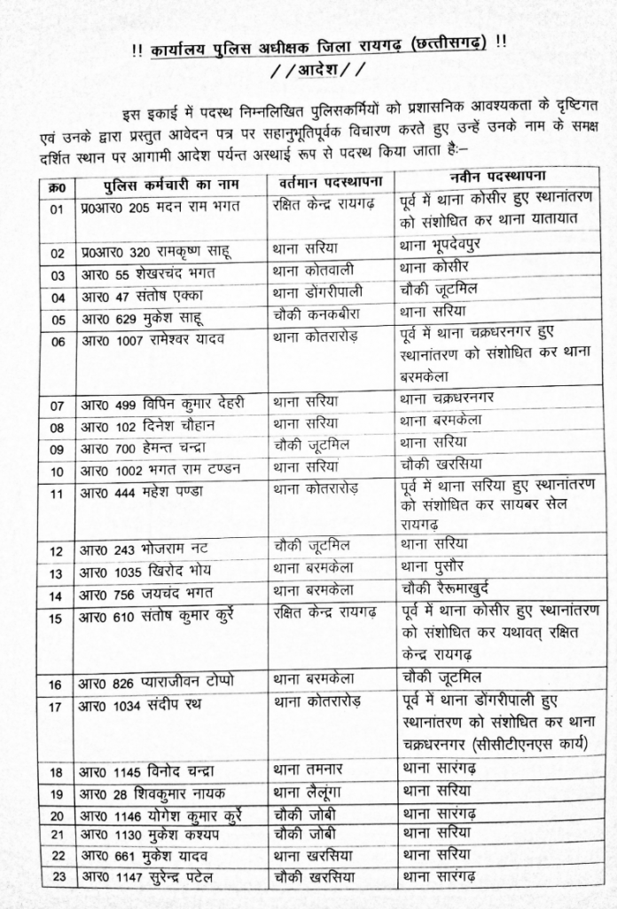 रायगढ़। पुलिस विभाग में एक बार फिर से तबादला हुआ है। रायगढ़ एसपी अभिषेक मीना ने ट्रांसफर आदेश जारी किया है। इस आदेश में प्रधान आरक्षक और आरक्षक सहित 32 पुलिसकर्मियों की ट्रांसफर हुआ है।