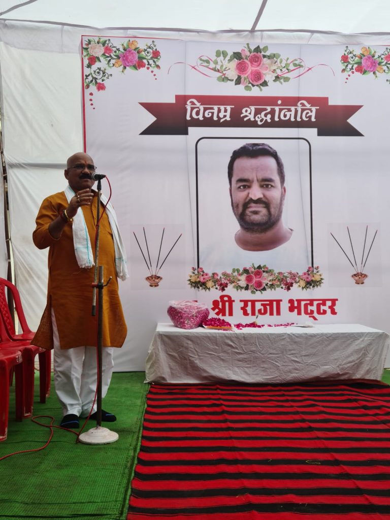 कन्हैया फैंस क्लब द्वारा स्व. राजा भट्टर को श्रद्धांजलि अर्पित करने श्रद्धांजलि सभा के साथ स्व. राजा की स्मृति में प्रसादी भंडारा आयोजित किया गया । श्रद्धांजलि सभा में ऐसा लगा जैसे राजा की प्रजा आ गई है । कन्हैया अग्रवाल ने राजा के साथ के संस्मरण याद करते हुए कहा, कि राजा का जीवन दूसरों के लिए समर्पित रहा, वो खुद अपने लिए एक पल भी नहीं जिया । स्व. राजा की अंतिम यात्रा में आया हर व्यक्ति रोया, हर आंख नम थी, हर आंख में आंसू थे । आज भी श्रद्धांजलि अर्पित करने सैकड़ों लोग आये हैं पर बोलने के पहले गला रूंध रहा है ।