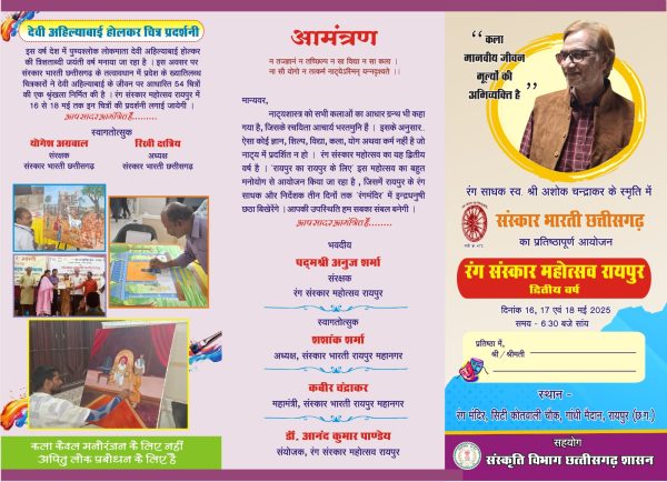 रायपुर।संस्कृति विभाग छत्तीसगढ़ शासन के सहयोग से ‘संस्कार भारती छत्तीसगढ़’ द्वारा रंग साधक स्वर्गीय अशोक चन्द्राकर की स्मृति में ‘रंग संस्कार महोत्सव रायपुर (द्वितीय वर्ष)’ का आयोजन 16 से 18 मई 2025 तक रंग मंदिर, गांधी मैदान, सिटी कोतवाली चौक, रायपुर में किया जा रहा है।