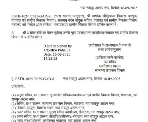 सामान्य प्रशासन विभाग (साप्रवि) द्वारा जारी आदेश के अनुसार, मंत्रालय में पदस्थ अपर विकास आयुक्त (संयुक्त सचिव) अशोक चौबे को पदेन अपर सचिव घोषित किया गया है। इसी तरह राज्य वित्त सेवा की उप सचिव श्रद्धा त्रिवेदी को संयुक्त सचिव पद पर पदोन्नति दी गई है।