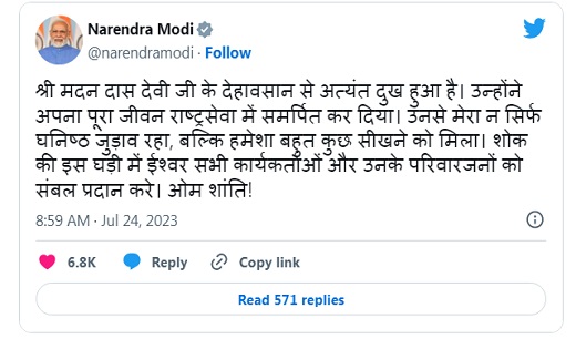 पीएम मोदी ने ट्वीट कर उन्हें श्रद्धांजलि दी है। प्रधानमंत्री मोदी ने लिखा, ‘मदन दास देवी जी के देहावसान से अत्यंत दुख हुआ है। उन्होंने अपना पूरा जीवन राष्ट्रसेवा में समर्पित कर दिया। उनसे मेरा न सिर्फ घनिष्ठ जुड़ाव रहा, बल्कि हमेशा बहुत कुछ सीखने को मिला। शोक की इस घड़ी में ईश्वर सभी कार्यकर्ताओं और उनके परिवारजनों को संबल प्रदान करे। ओम शांति!’
