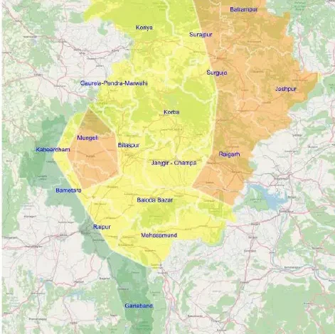 मौसम विभाग ने जिन जिलों में अलर्ट जारी किया है, उनमें सुकमा, बीजापुर, दक्षिण बस्तर दंतेवाड़ा, बस्तर, नारायणपुर, कोंडागांव, कांकेर, धमतरी, बालोद, राजनांदगांव, गरियाबंद, महासमुंद, रायपुर, बलौदा बाजार, जांजगीर-चांपा, रायगढ़, बिलासपुर, कोरबा, जशपुर, गौरेला-पेंड्रा-मरवाही, दुर्ग, बेमेतरा, कबीरधाम, मुंगेली, सरगुजा, सूरजपुर, कोरिया और बलरामपुर शामिल हैं।
